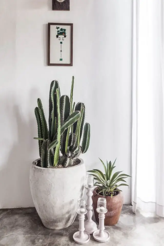 Enfin, il y a les plantes en pot notamment des cactus qui nous font penser au désert, au climat aride (ce qui n'est clairement pas le cas en Asie du sud-est). Le vert des plantes fait écho à quelques éléments de couleur verte dans la pièce de vie: les chaises qui entourent la table de salle à manger, l'assise des tabourets de l'îlot de cuisine, le petit meuble de rangement.