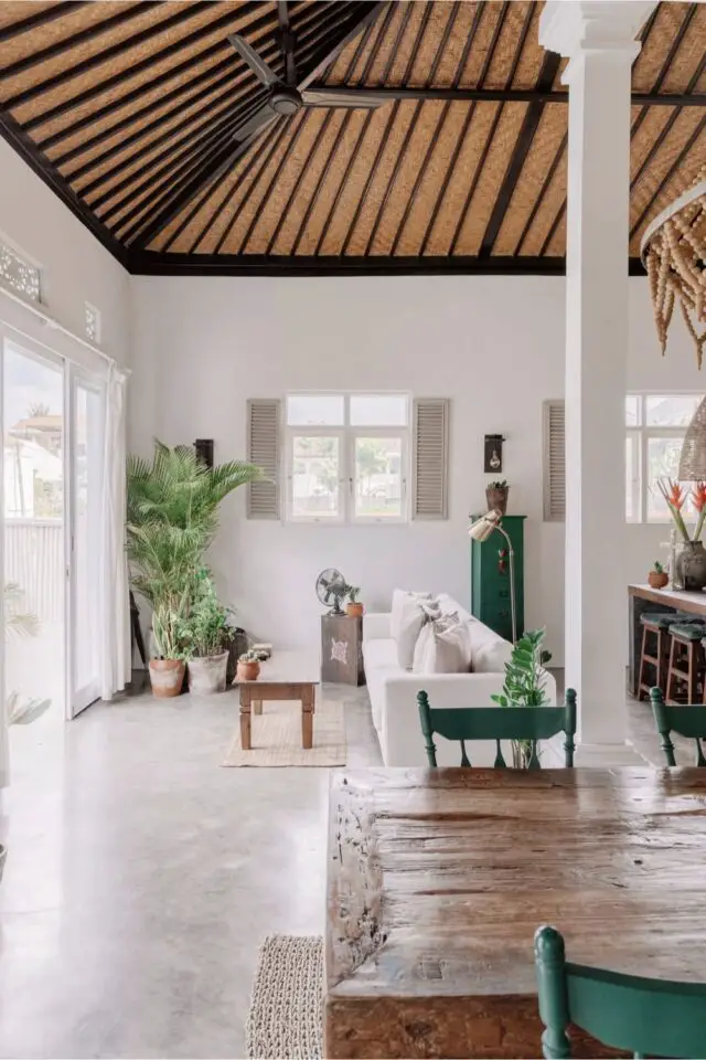 Plus local, on peut regarder le plafond de la grande pièce à vivre ouverte. Il est en feuilles de palmier tressées. Ce revêtement atypique vous fera voyager sans l'ombre d'un doute. C'est un détail typique et local qui est bien plus chaleureux (et léger) qu'un plafond en BA13 classique.