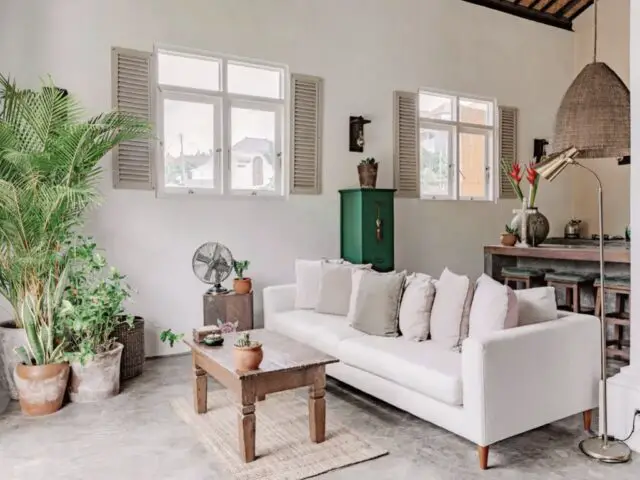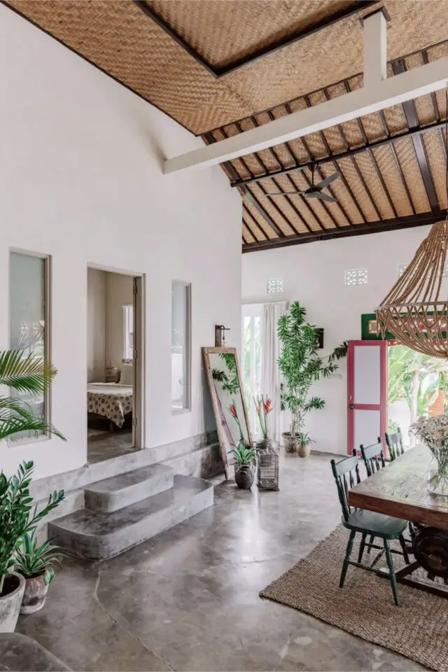 Commençons avec le style mexicain très étonnant puisque la maison est située en Indonésie. Il y a 3 éléments phares qui créent cette ambiance. D'abord, l'omniprésence du béton ciré. Dans la plupart des pièces, il se trouve au sol. Un sol en béton ciré peut créer une atmosphère authentique et simple. On le trouve aussi comme revêtement de meuble pour la cuisine ou comme revêtement mural dans la salle de bain.