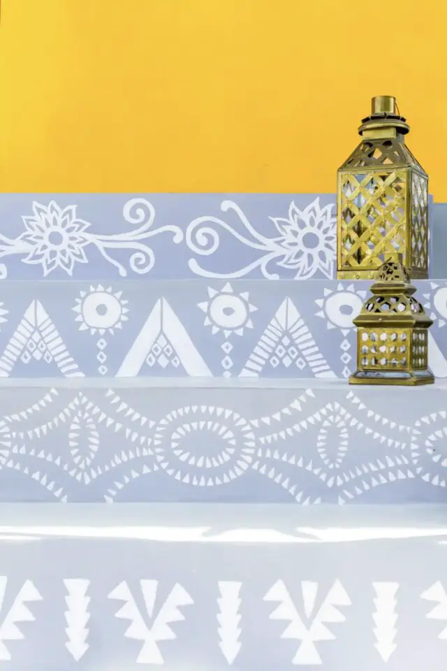 La façade de la maison est jaune soleil, parfaite pour mettre de bonne humeur. Le petit soubassement est dans un gris bleuté plus doux et pour mettre en évidence les marches, des motifs mexicains sont peints en blancs.