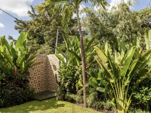 Enfin dernier point plus discret: il y a une douche extérieure dans un coin du jardin. Elle est assez discrête puisqu'elle est entourée de plantes tropicales. Cependant, je suis en amour devant les carreaux de ciment utilisés comme revêtement mural. Le jaune, le bleu, le rose, le motif fleurs / soleil sont simples mais tellement joyeux.