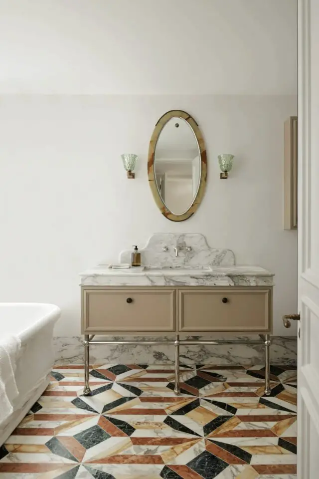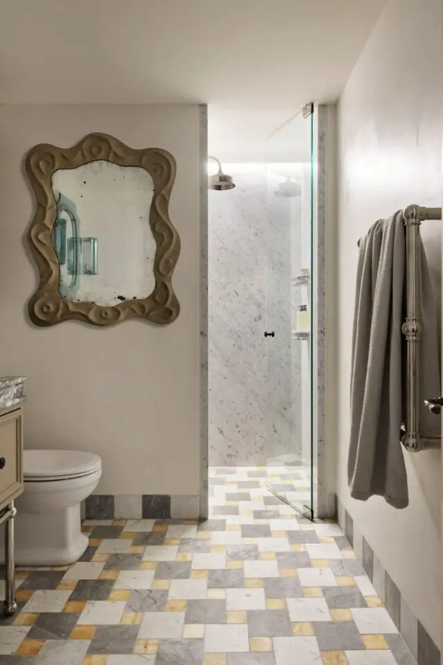 Commençons par évoquer l'élégance et intemporalité de l'appartement. Les revêtements y sont pour beaucoup. Et dans la plupart des espaces, on trouve du marbre. Crédence de cuisine, plan de travail, plans vasques, revêtement de douche ou encore revêtement de sol. Un marbre blanc avec des veine plus foncées qui apportent de la vie. Les revêtements de sol des salles de bains sont particulièrement intéressants. Pas de grandes plaques de marbres mais un mélange de matériaux avec des formats qui sortent sans conteste de l'ordinaire. Si on ne trouve pas de marbre, on trouve du bois, lui aussi très élégant, lui aussi dans un format de parquet qui sort de l'ordinaire.