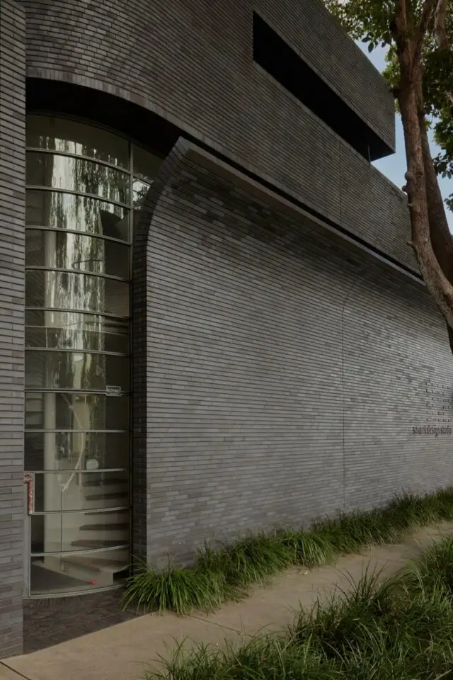 Ce logement / bureau est situé dans une zone réglementée. L'architecte et propriétaire a du suivre un cahier des charges spécifique pour intégrer son projet à l'environnement. De l'extérieur, il est impossible d'imaginer ce qui se trouve à l'intérieur. On voit des murs couverts de briquettes grises et élégantes en façade, un mur courbe en pavés de verre, un toit cylindrique. En passant et en ne sachant pas ce qui se trouve à l'intérieur, on pourrait y voir une certaine forme d'austérité.