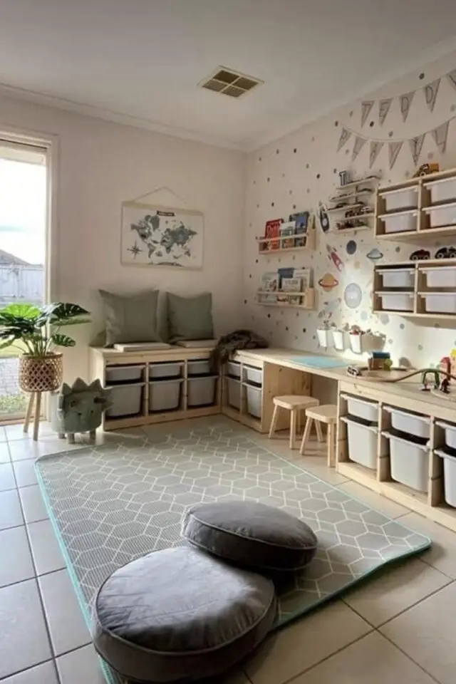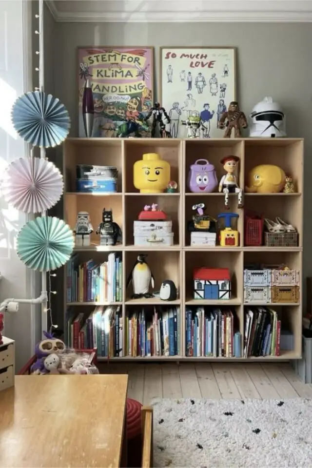 Et puis, il y a la question des bibliothèques et meubles de rangements pour les jouets. Même si l'idéal est de désencombrer la chambre un maximum pour que ce soit agréable pour les enfants, on ne peut pas passer au dessus de cette question de rangement. On a déjà plusieurs meubles hauts (le lit superposé + la ou les armoires). Pour une question d'équilibre visuel, il est préférable de partir sur des meubles bas qui seront plus léger.