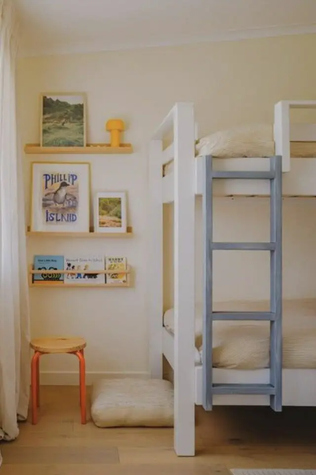 Dans le cas où les lits superposés font face à la fenêtre et qu'il reste un espace entre le lit et le mur, il est possible d'aménager cet espace pour créer pourquoi pas un coin lecture. Une petite bibliothèque au pied du lit, un gros coussin de sol, une lampe pour y voir clair et le tour est joué.