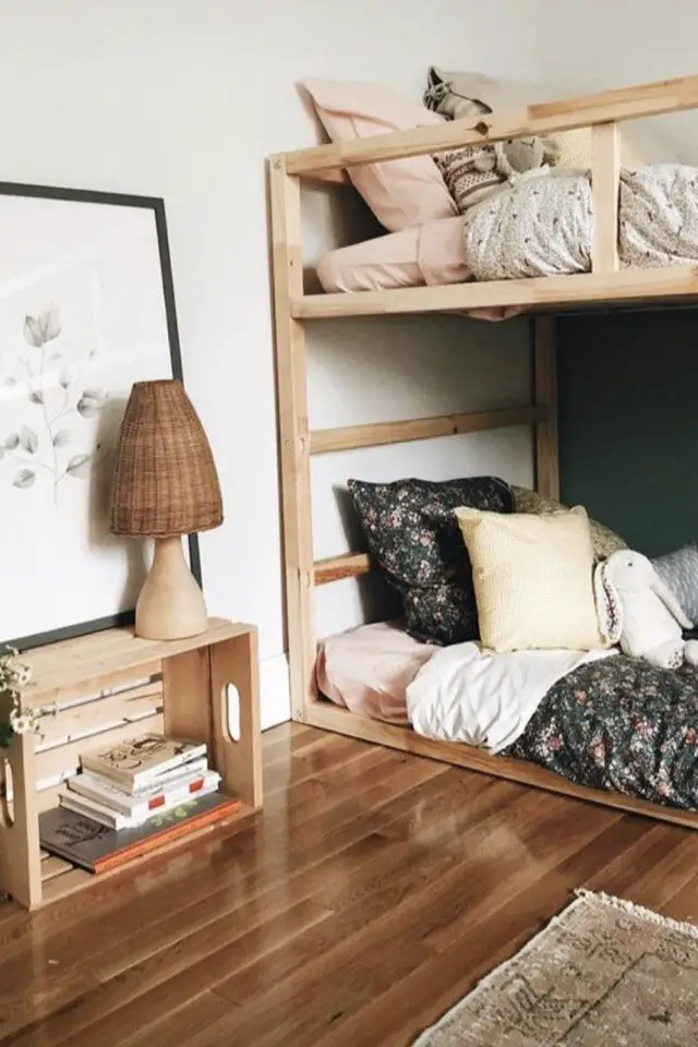 On commence avec les lits. Pour un gain de place, les lits superposés sont parfaits. Il est préférable de choisir des lits superposés l'un au dessus de l'autre plutôt que deux lits en perpendiculaire parce que cette dernière configuration a une plus grande emprise au sol (et donc fait perdre de l'espace). Le seul bémol avec les lits superposés c'est qu'il n'est pas possible de les placer sous la fenêtre de la chambre. Ils poseraient problème pour l'ouvrir.