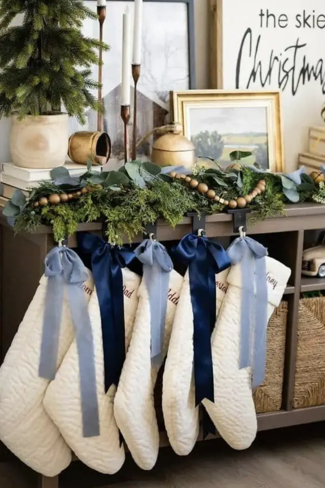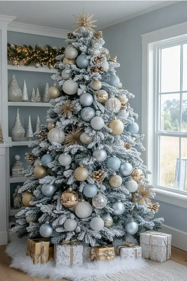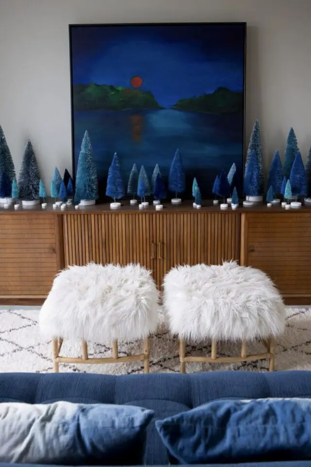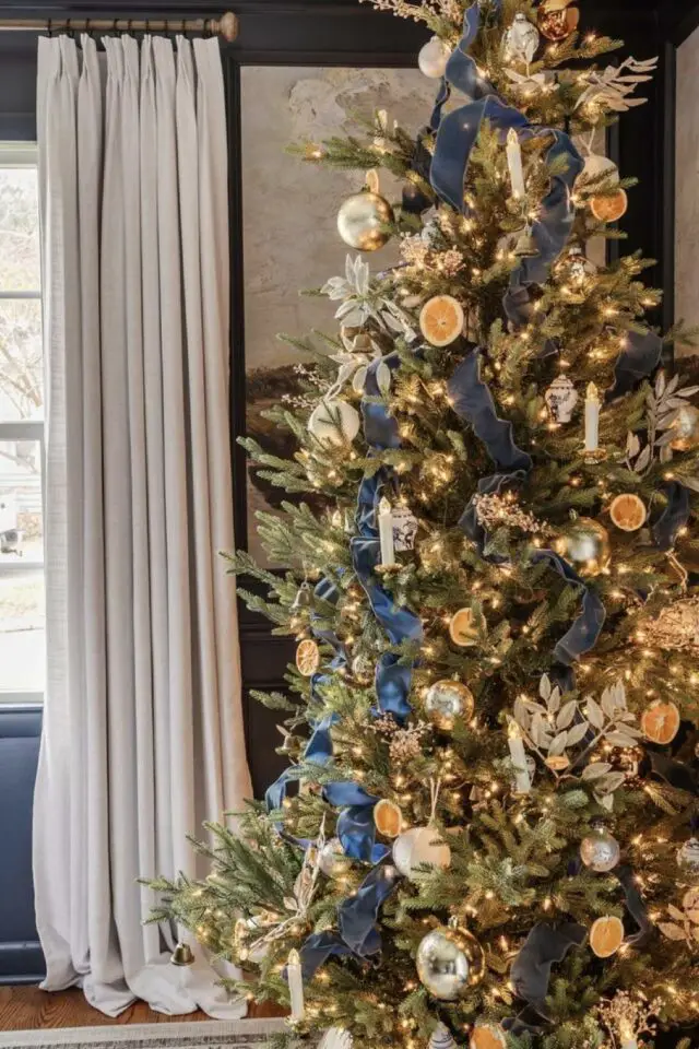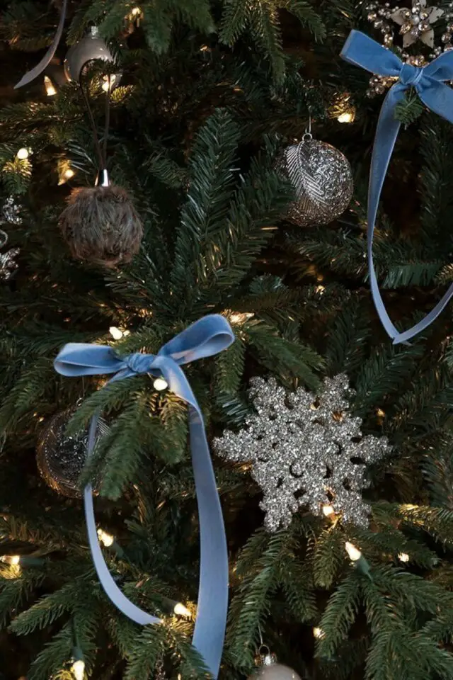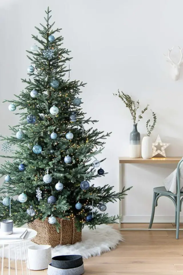 Pour parfaire la magie de noël, le bleu s'associe très facilement avec le doré ou l'argenté qui sont des couleurs festives par excellence. On peut aussi partir aussi sur un mariage de déco bleues et blanches. N'ayez pas peur d'avoir un effet bord de mer, c'est peu probable. Les décorations de noël chassent vite cette idée.