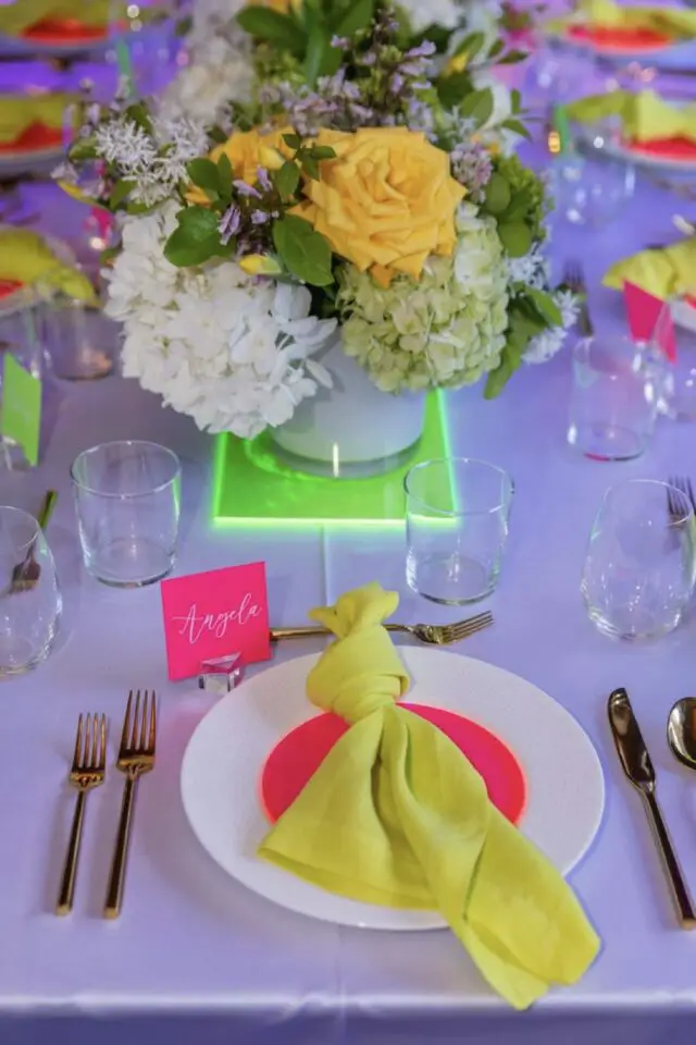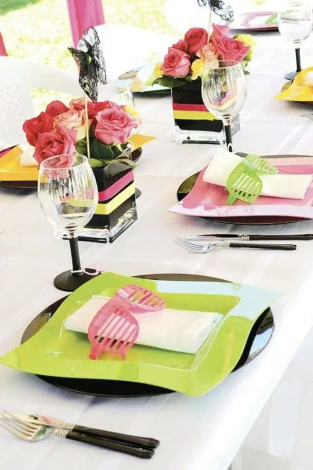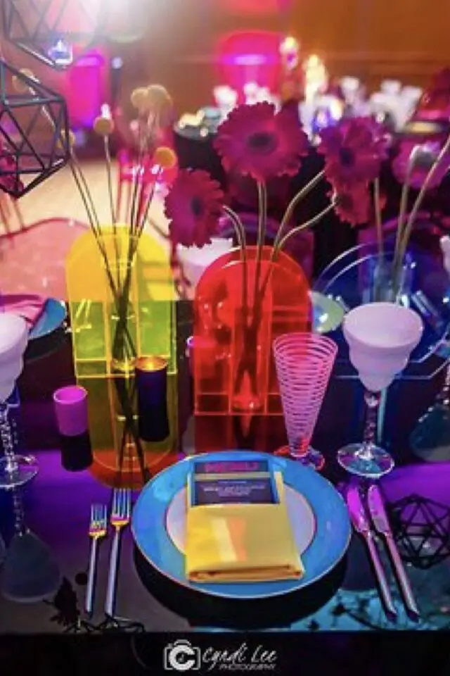 Il est assez facile de trouver des lots de bracelets fluorescents qui vous pouvez disposer un peu partout dans la pièce. Pour parfaire votre ambiance déco, il est aussi possible d'opter pour de la déco de fête couleur fluo. Jaune, rose, vert, bleu... en fluo pour un esprit années 90 et club rétro. On ajoute à cela une ou plusieurs boules à facettes pour conforter l'idée de piste de danse et le tour est joué. C'est un thème déco qui se veut assez simple. La couleur et l'effet fluorescent suffisent pour offrir une ambiance festive à un salon transformé en piste de danse.