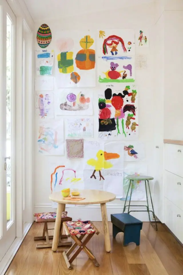 Toutes les pièces se prêtent à ce type de déco - même si les pièces humides comme la salle de bain, c'est moins fréquent (mais pas impossible). Dans l'entrée, les dessins donnent le ton immédiatement d'une maison familiale où les enfants peuvent s'exprimer librement. Dans le salon, les oeuvres de votre kid contribueront à l'idée de vie relative à la pièce. Idem pour la salle à manger.