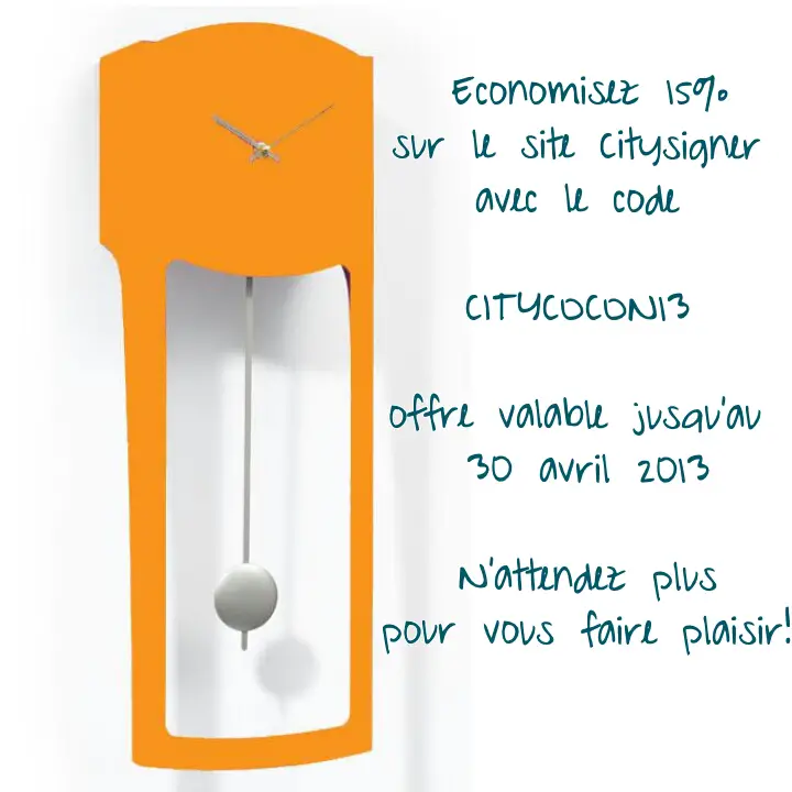 Citysigner est une boutique en ligne de mobilier, de luminaires et d'accessoires déco en acier. C'est coloré, c'est frais et cela vous permettra de personnaliser votre intérieur de manière contemporaine. Histoire de vous faire plaisir, Citysigner vous offre 15% de remise* jusqu'au 30 Avril 2013 avec le code CITYCOCON13 . N'hésitez plus et découvrez la boutique Citysigner!
