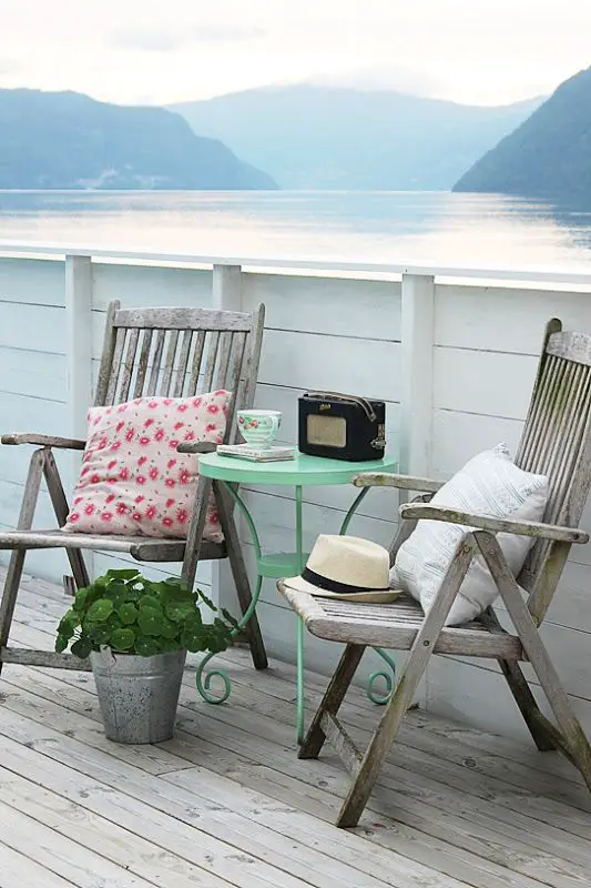 Le ptit déj aux allures de vacances? Aménagez vous un espace différent en extérieur pour les beaux jours. Sur la terrasse ou sur le balcon, une table aux couleurs vieillies par les intempéries, des coussins pour que ce soit confortable et le tour est joué!