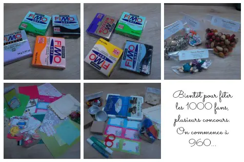 Pour cette page qui devient grande, j'ai décidé de vider mon atelier petit à petit... Tous les 10 fans, un nouveau concours sera en ligne. Et ce, jusqu'à 1000 fans épuisement du stock! Ce sont des concours essentiellement pour les créatrices: fimo, bijoux, scrap, bidouillage, couture...