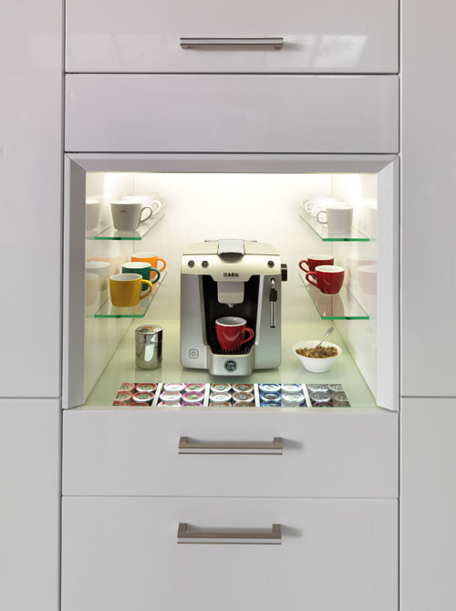 Autre nouveauté chez Hygena, c'est l’innovation en intégrant la technologie dans la cuisine pour votre confort mais aussi votre plaisir. Avec la création de Café In pour les amoureux du café, comme moi, Hygena propose maintenant au sein de ses produits, un espace dans la cuisine spécialement réservé au café. Il n'est pas juste question de poser sa machine expresso sur le plan de travail. Au contraire, c'est un véritable espace dédié au café: Tout est réfléchi pour que la préparation du café soit regroupée au même endroit, avec en prime un côté design agréable à regarder grâce au jeu de transparence.