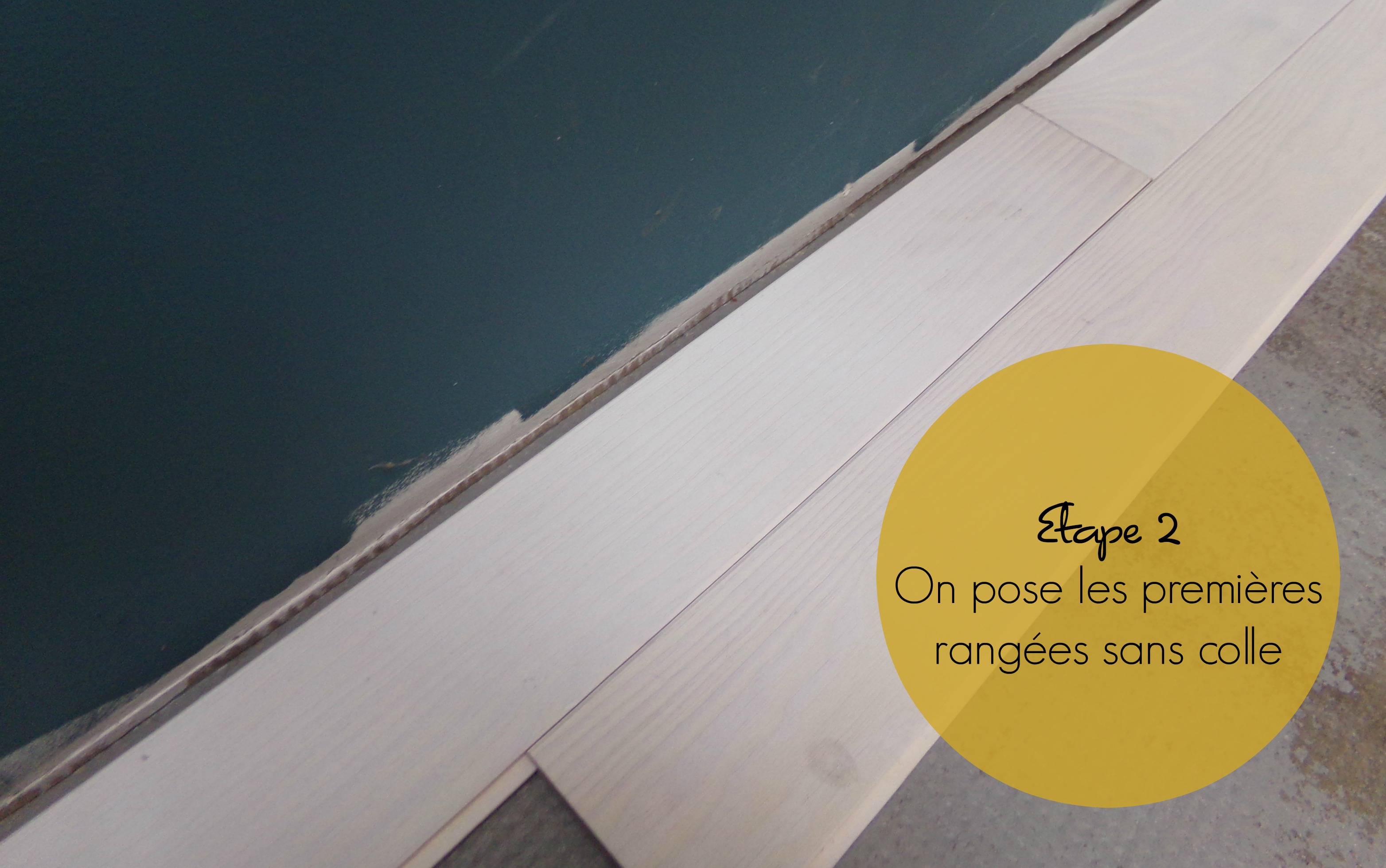 Une fois que les 2 premières rangées sont posées, il suffit de poser le reste de la surface de la même manière, deux rangées par deux rangées. Cela évite que la colle sèche et vous laisse le temps de faire les découpes tranquillement. N'oubliez pas de laisser 8 à 10 mm tout autour de votre pièce pour la dilatation du bois.
