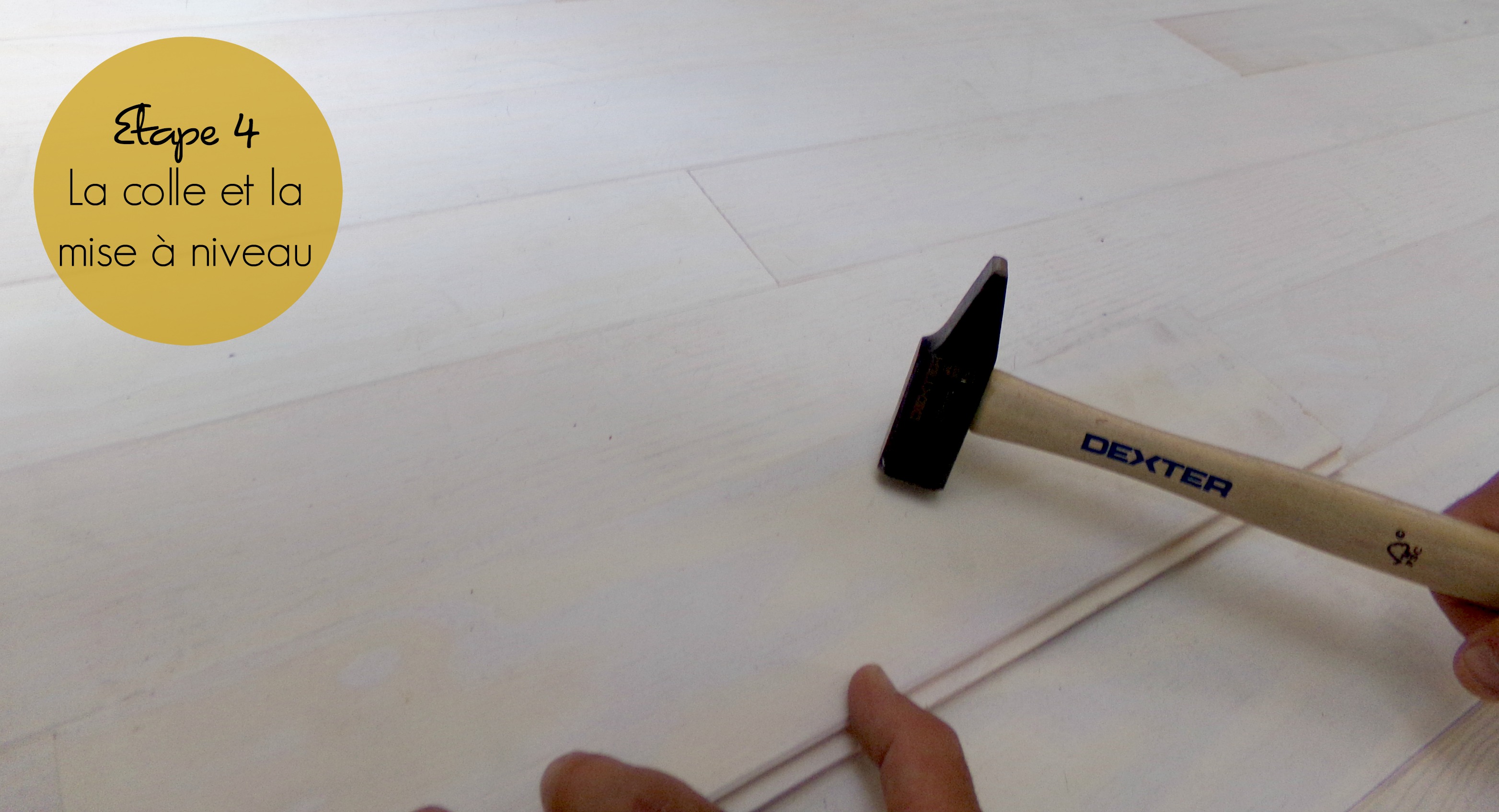 Une fois que les 2 premières rangées sont faites, il est temps de passer au collage. On démonte les lames que l'on vient de poser. (On ne les mélange pas pour éviter de perdre du temps et notre patience). Avec une spatule crantée, on étale la colle sur la surface des deux rangées. (Vous pouvez si vous le souhaitez faire un repère sur le sol avec un crayon de bois, pour vous aider). Et on repose le parquet sur la colle et on appui sur le parquet afin que la colle s'étale sur l'ensemble de la lame. Avec un niveau à bulle, on vérifie que les lames sont à niveau et droites. Si ce n'est pas le cas, on utilise le martyr et un petit marteau pour retrouver le niveau. On tape délicatement!