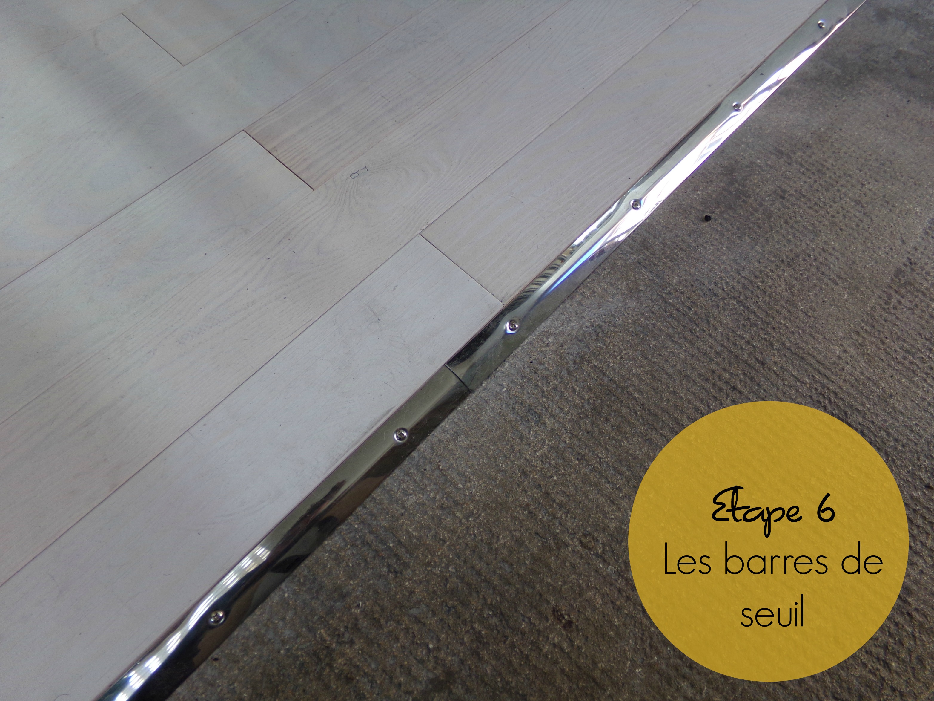 On a aussi posé des barres de seuil. Comme vous avez pu de voir, à la maison, nous n'avons pas de murs pour séparer les espaces. Mais on devait faire la jonction avec le parquet stratifié existant et le parquet collé qu'on venait de poser.