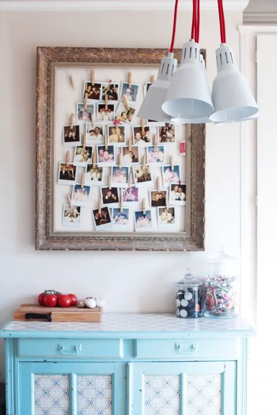 En brocante il est assez facile de trouver un vieil encadrement de tableau. Bien souvent, le tableau à l'intérieur est spécialement moche. Mais ce n'est pas grave! Ce n'est pas ce qui nous intéresse. Il suffit de garder le cadre et de monter quelques fils qui supporteront vos photos. Des petites épingles en bois pour tenir les photos et le tour est joué!