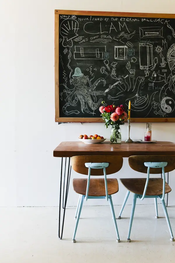Les dessins des enfants comme déco c'est chouette. Surtout quand ils peuvent jouer à la maitresse ou effacer régulièrement leurs dessins. Cette idée déco est régulièrement renouvelée et donne de la vie à votre pièce. Ca marche aussi avec les copains qui se feront un plaisir de laisser un message dessus, lors d'une soirée