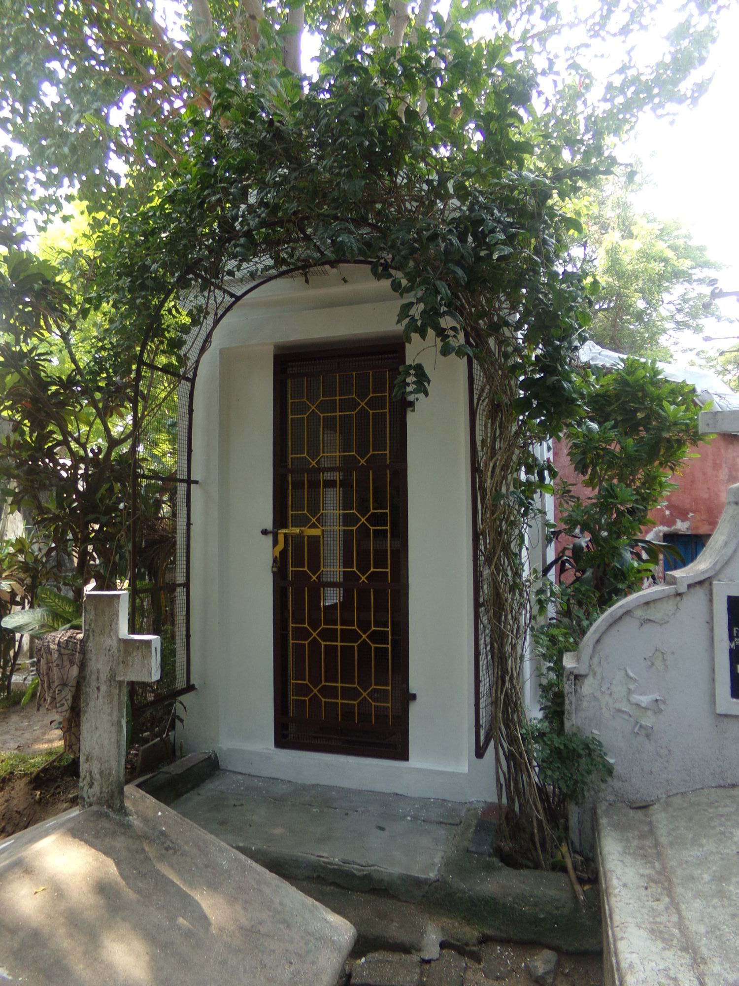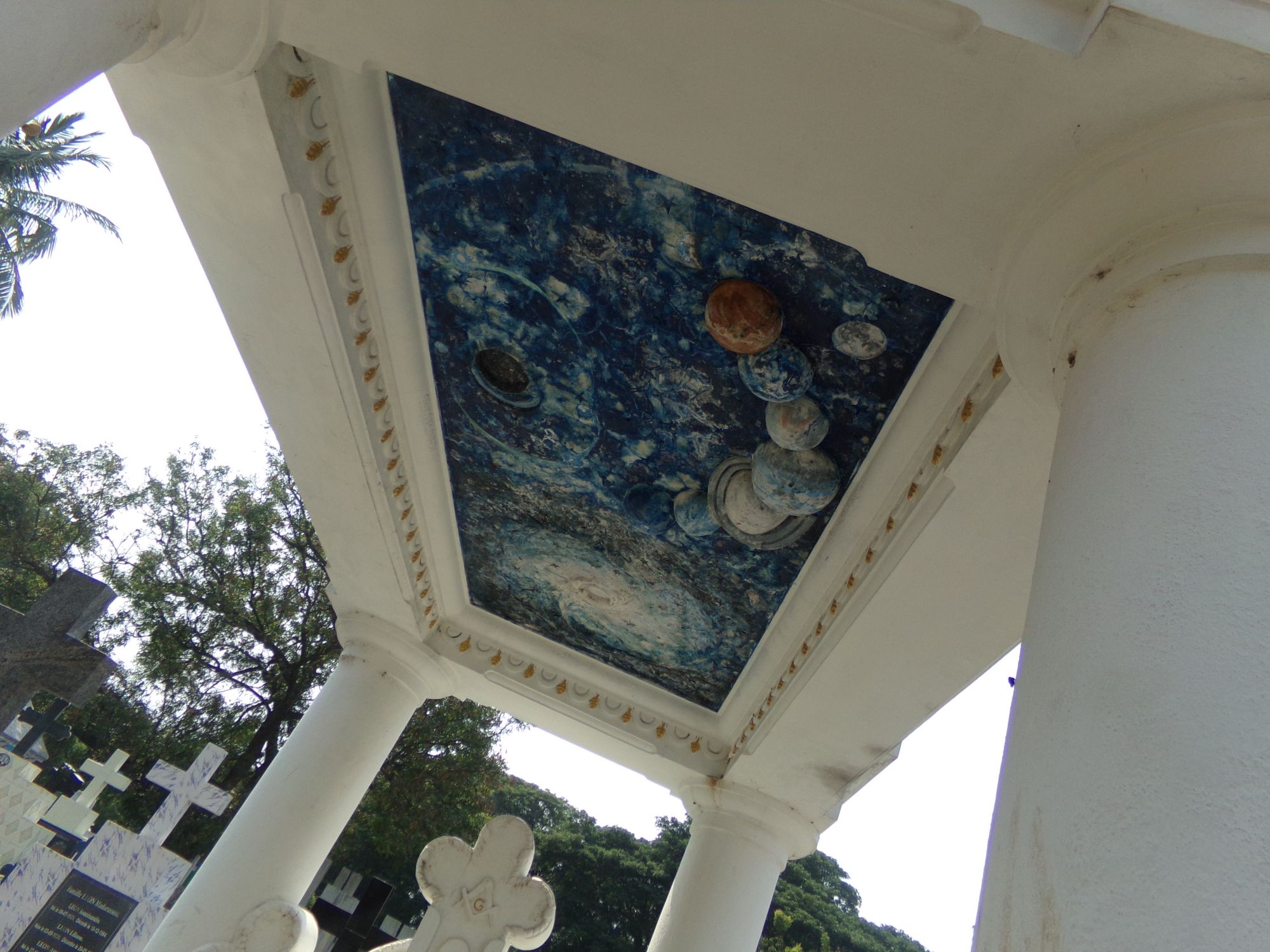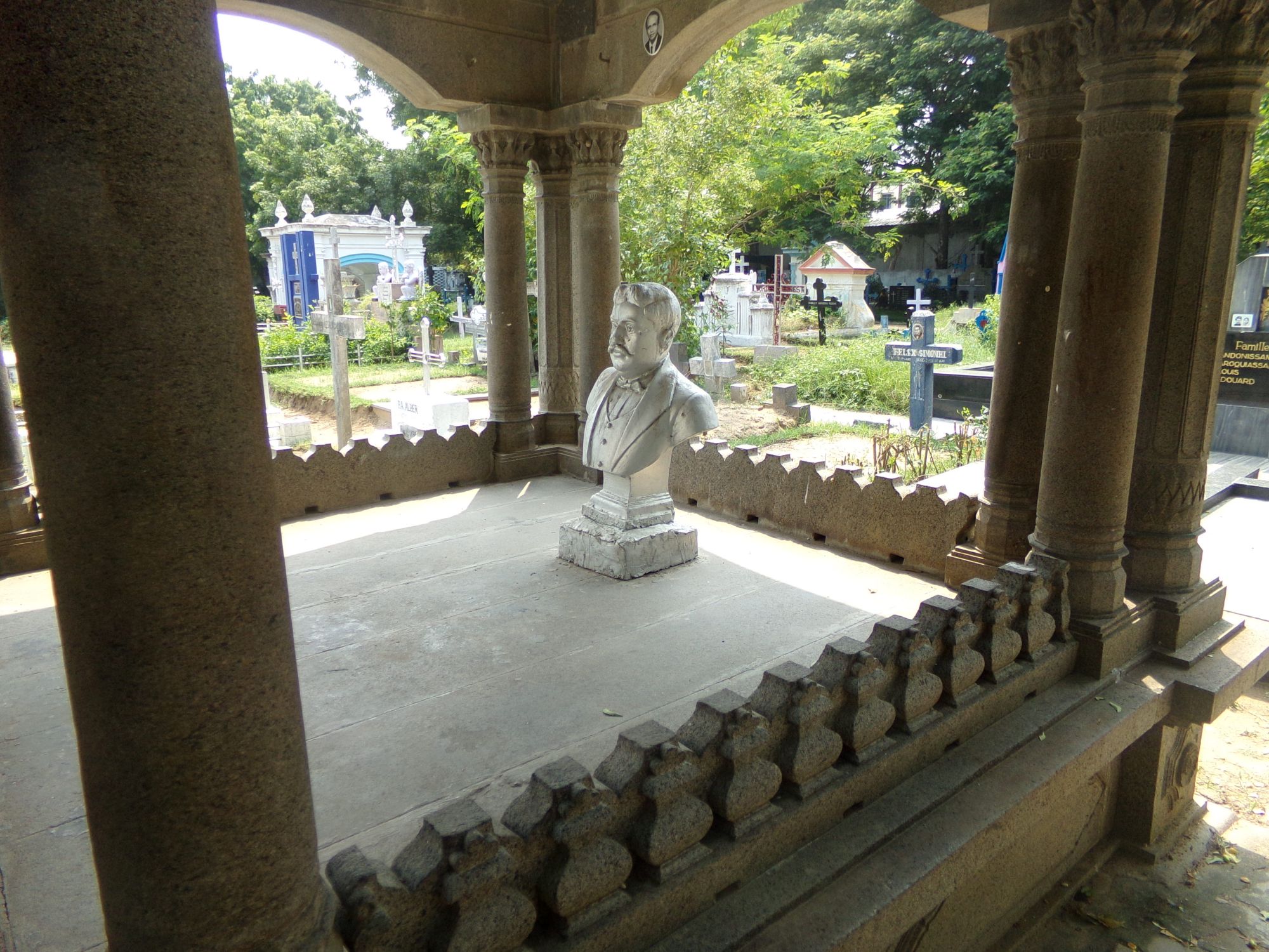 Il faut savoir qu'en Inde, la religion la plus pratiquée est l'hindouisme. Il y a des temples partout. On a déjà eu l'occasion de croiser à plusieurs reprises des processions festives et des processions funéraires. Pour ces dernières j'y consacrerai un article à part entière, parce que ça vaut au moins ça. Bref, en Inde, ils sont hindous et par conséquent, ils se font incinérer dans la majorité des cas. Mais, il n'y a pas que des hindous. Il y a des musulmans aussi et des catho. Il y a des couvents, des églises très jolies et des messes en anglais, en tamoul et en français selon l'heure et là où tu vas. Passons! Donc, s'il y a des catho, il y a des cimetières. Dans cet article, je ne vous montre que le cimetière français. En face de celui-ci il y a le cimetière anglais et au cours de nos promenades, on a aussi eu l'opportunité de croiser des cimetières musulmans. (Mais ces deux derniers points feront probablement l'objet d'un article).
