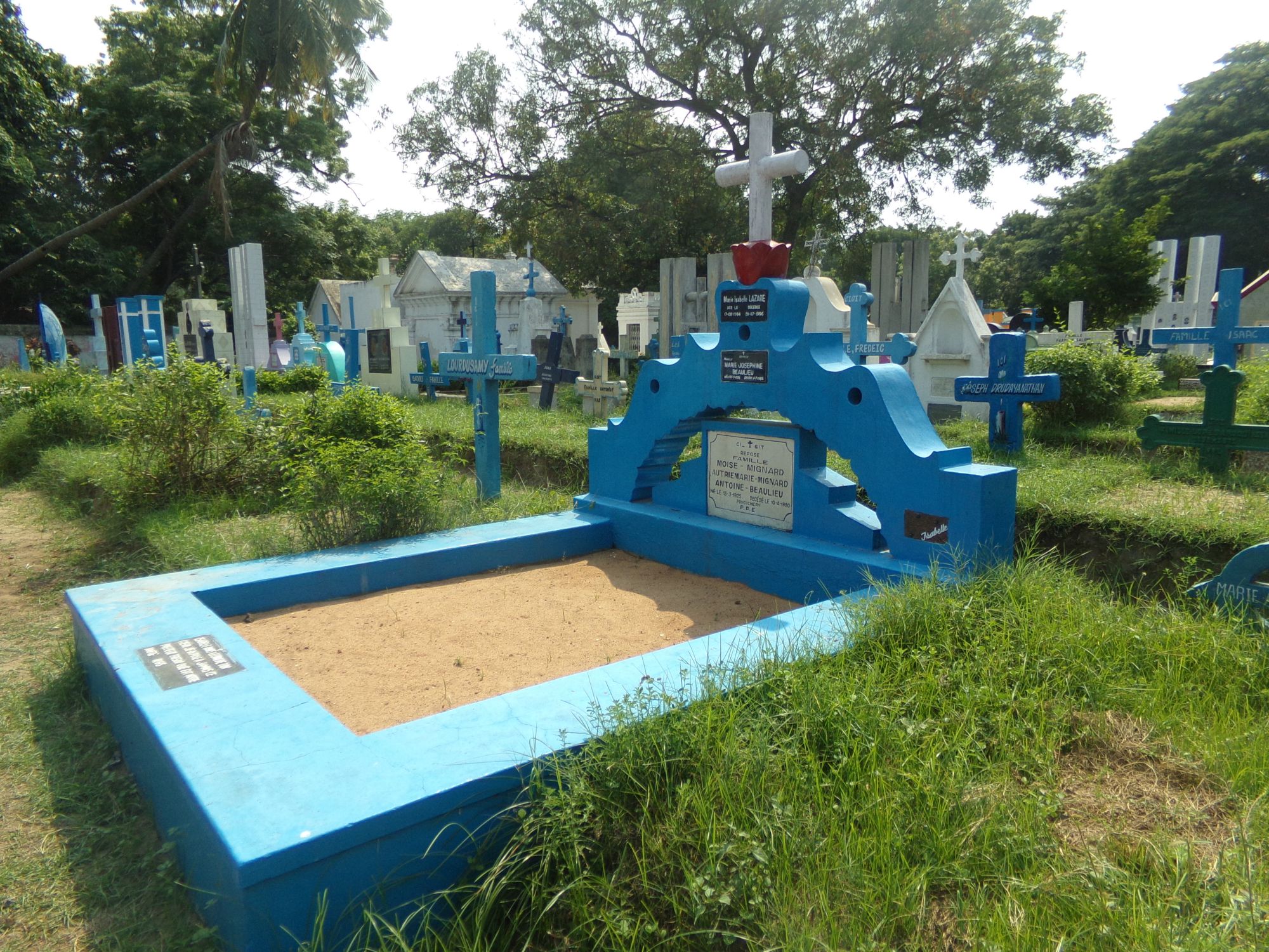 Comme on est en Inde, ce lieu ne dénote pas dans le paysage. Autrement dit on y retrouve le même contraste que l'on retrouve partout ailleurs: des ruines et des caveaux très entretenus à côté des uns des autres. La même chose pour la taille du monument funéraire: une petite croix jolie et sans prétention peut très bien être à côté d'un gros caveau d'une illustre famille pondichérienne. Bref, un lieu aux multiples contrastes que j'avais envie de partager avec vous! (Et pour une fois, je partage beaucoup de photos!!!)