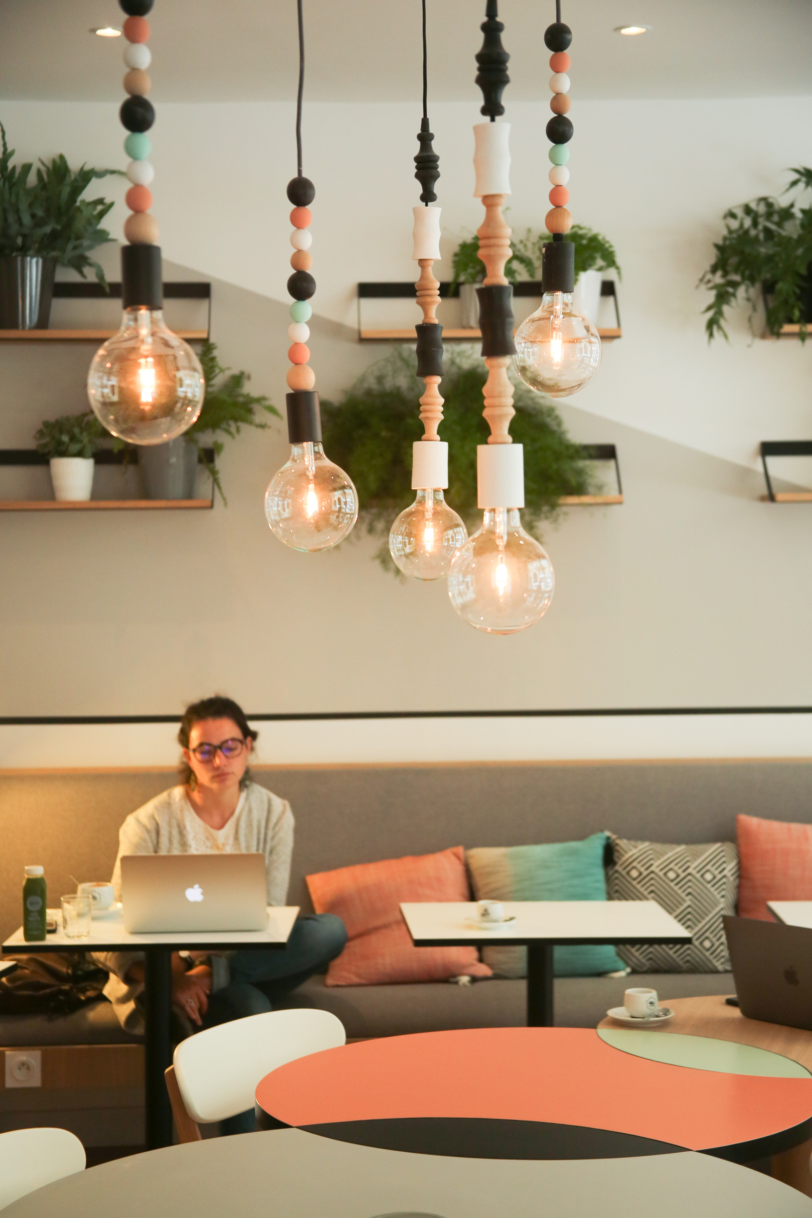 On retrouve l'idée de bien être dans la décoration de ce lieu. Matières naturelles, couleurs chaleureuses, lumière propice au travail... Tout est fait pour vous donner envie de travailler dans la bonne humeur.
