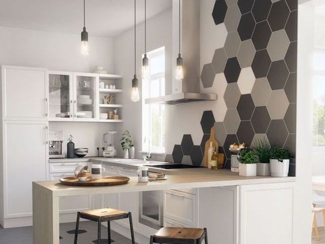 10 - On termine avec une crédence qui sort de l'ordinaire à plus d'un titre. On remarque qu'elle est aussi une crédence haute qui s'arrête au plafond. Elle est composée de grands carrelages géométriques, ce qui crée une ambiance jeune et dynamique. Et il t a le jeu des couleurs de carrelages qui est lui aussi intéressant. On ne s'ennuie définitivement pas avec cette crédence 100% contemporaine.