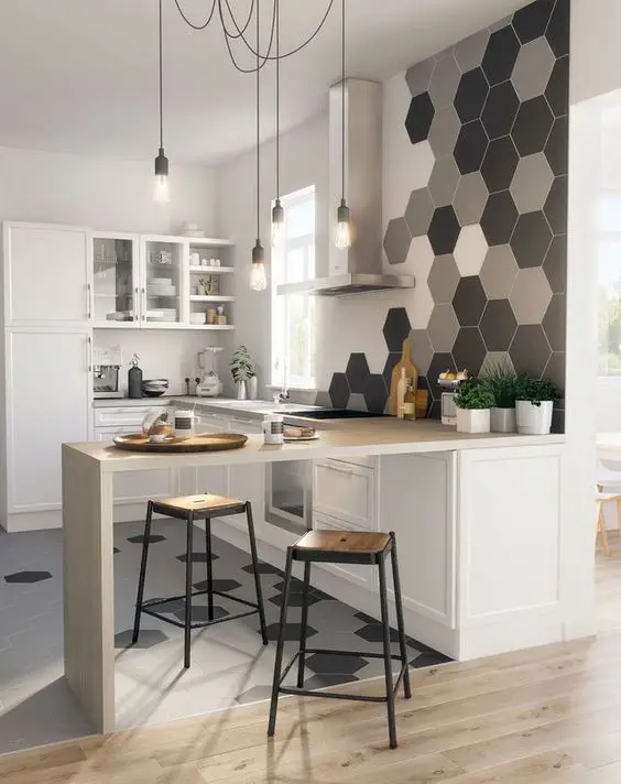 8 - La crédence haute. Souvent quand on pense à crédence, on se contente des hauteurs standards. Mais rien ne vous empêche de créer une crédence en carrelage plus haute, surtout si vous avez une belle hauteur sous plafond.