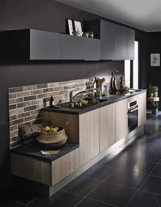 7 - Si vous souhaitez apporter un peu de nouveauté dans votre cuisine sans tout changer, cette déco peut vous donner des idée. Ce qu'il m'a plu dans cette cuisine, c'est la crédence qui fait contraste avec le mobilier. Elle attire l'oeil. Mais la couleur de la crédence se retrouve dans d'autres éléments de la cuisine, comme la chaise et la vaisselle. Alors l'alliance du gris et du jaune, n'est peut-être pas du goût de tout le monde, mais c'est une idée facilement réalisable grâce à la peinture pour crédence et il suffira de prendre la même teinte de peinture mais pour le bois afin de peindre la chaise. En 1/2 journée, vous apporterez du nouveau dans votre cuisine!