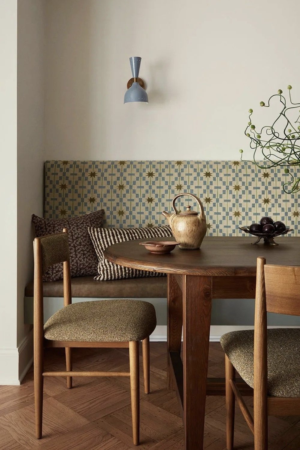 Dans la salle à manger, les chaises ont un rôle capital à plus d’un titre. Elles doivent être confortables. Elles ne doivent pas être trop imposantes non plus. Des gros fauteuils c’est tentant, mais si vous cherchez à gagner de la place ce n’est probablement le meilleur des choix. Au pire, vous pouvez opter pour des chaises visuellement plus légères et deux fauteuils en bout de table.