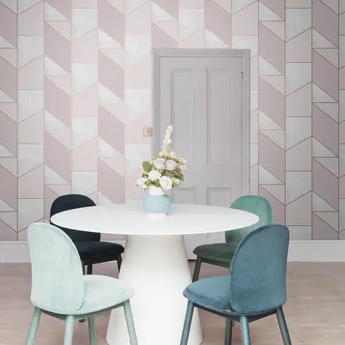 Bien que le rose, notamment dans ses nuances les plus claires, soit facile à vivre, vous n'êtes pas dans l'obligation de peindre tous les murs de votre pièce de vie en rose. Si votre salle à manger est blanche, vous pouvez peindre un mur en rose pour lui donner de la profondeur ou pour mettre en valeur votre buffet. Le rose est souvent choisi dans une nuance clair pour garder en luminosité. Il existe d'ailleurs de nombreux papiers peints roses qui vous permettront d'habiller les murs de votre pièce de repas. Ce qui est intéressant avec le papier peint notamment l'intissé c'est qu'il permet de cacher les petits défauts au mur.