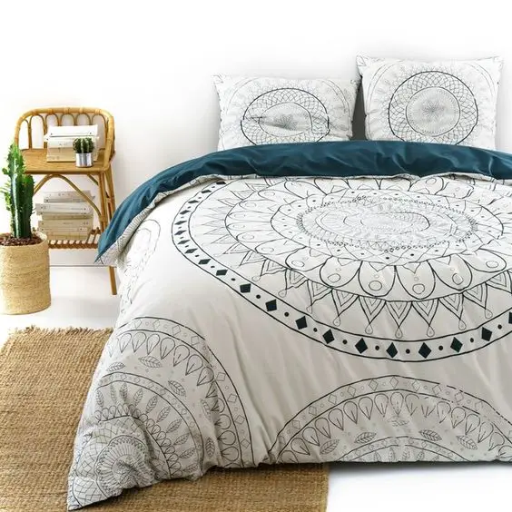 Dans une chambre unie, les motifs peuvent apparaitre sous la forme d'une housse de couette par exemple. Ce qui est sympa c'est que régulièrement on la change et donc on ne s'en lasse pas. Une semaine, on a la chambre qui invite au voyage grâce aux motifs jungle. La semaine suivante, on passe sur un univers scandinave avec des motifs géométriques simples et pastels... Et ce ne sont que deux exemples parmi la large gamme de motifs dans les parures de lit.