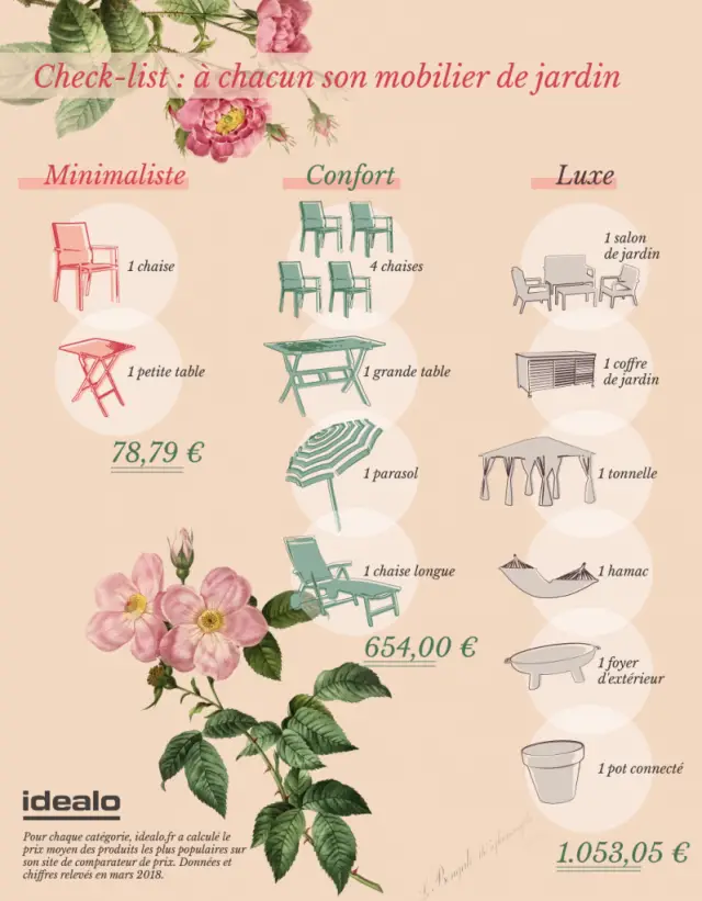 Enfin, dernière solution pour faire des économies dans l’aménagement extérieur: Comparer les prix avant d’acheter. Craquer sur un coup de coeur n’est pas forcément une bonne idée si vous avez un budget serré. Et pour comparer les différents prix, je vous propose de découvrir Idealo, un comparateur de prix efficace qui recense des milliers de produits pour l’extérieur comme pour l’intérieur. Je vous propose d’ailleurs de découvrir cette infographie réalisée par le comparateur autour de l’aménagement de jardin. Vous verrez en coup d’oeil que la fourchette de prix peut être très large quand on souhaite meubler son espace extérieur.