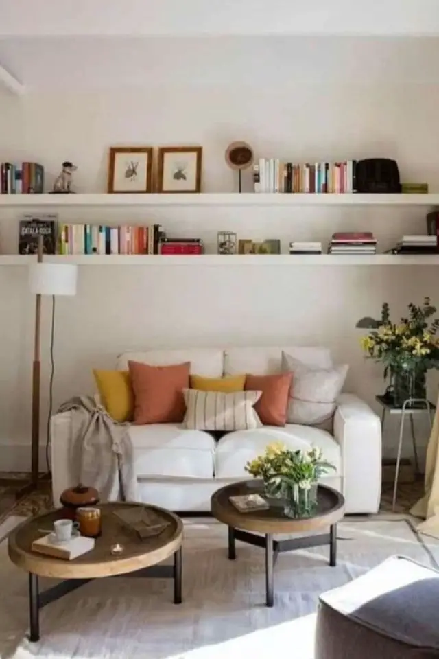 Pour gagner de la place, n'hésitez pas à monter sur les murs. Souvent sur le mur du canapé, on accroche des cadres, mais là aussi on peut y trouver des étagères qui vous permettront de mettre de la déco ou des livres. Certains modèles d'étagères sont très peu larges pour ne pas donner un sentiment d'étouffement.