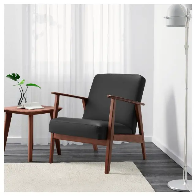 Toujours dans l'esprit mid-century mais plus foncé, on a le fauteuil Ekenäset de chez Ikea.