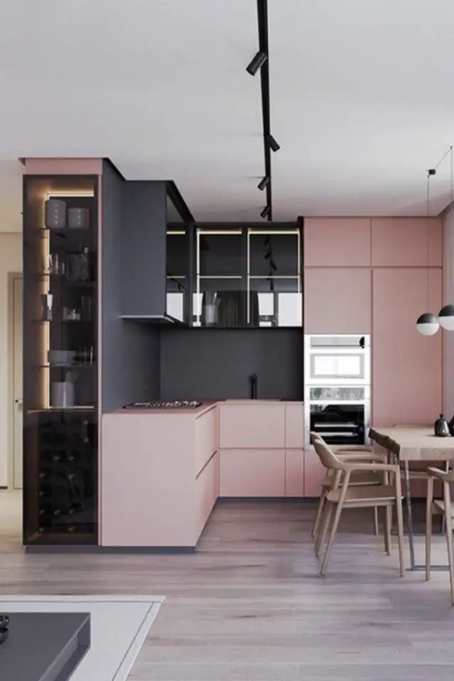 Revenons à l'époque contemporaine avec l'association du rose poudré et d'une couleur sombre. C'est cette dernière qui va offrir à votre cuisine un côté intime et moderne. Le rose va créer un contraste, il va aussi contrebalancer le froid de la couleur sombre et apporter de la luminosité. C'est un choix audacieux que je ne conseille pas forcément. Il faut que votre cuisine soit suffisamment lumineuse et éclairée pour qu'elle reste agréable au quotidien.