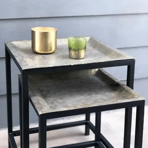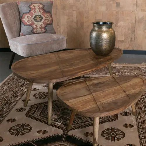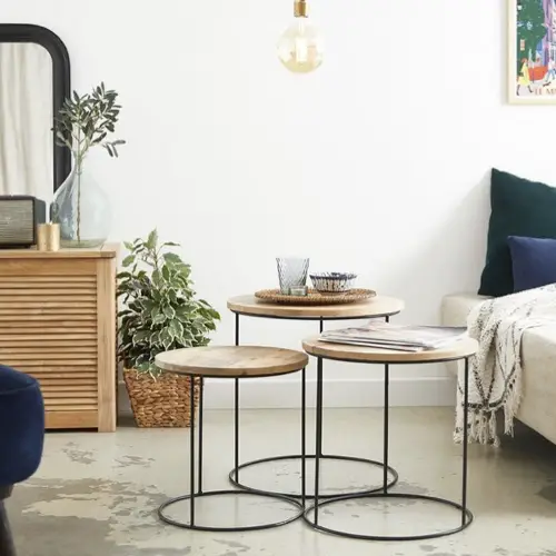 Une unique table pour créer une unité au centre du salon c’est le schéma le plus classique. Il est cependant possible d’en avoir plusieurs. Comme par exemple les tables gigognes. Ce qui est intéressant en plus de leur nombre, c’est qu’elles peuvent s’empiler pour gagner de la place si besoin (pour jouer à la console devant la télé par exemple!) Sans pour autant partir de sur la table gigogne, si vous avez de la place dans votre salon et plusieurs canapés et fauteuils, vous pouvez créer une composition de tables. Par exemple acheter 3 tables identiques et les positionner de manière parallèle pour un effet graphique sans alourdir votre espace.