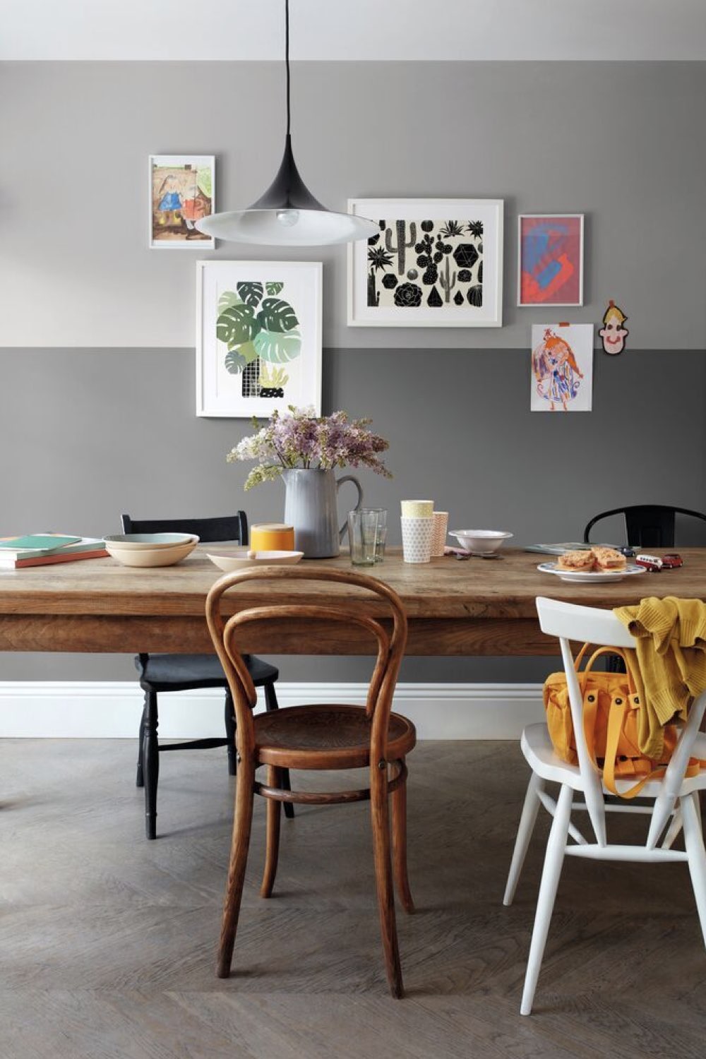 La première chose à laquelle on pense quand on parle couleur, c'est de l'appliquer sur les murs: Peintures, papier-peints... le gris se décline sous toutes ses nuances pour créer un univers amical, doux, propice aux bons moments. Souvent on a tendance à choisir un gris perle pour que la couleur des murs n'assombrisse pas la pièce. Mais on peut très bien partir sur un gris associé au bois clair pour réchauffer l'atmosphère. Le gris ardoise ou le gris anthracite quant à eux apporteront une certaine dose de raffinement et de caractère à votre salle à manger.