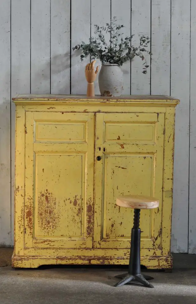 Le mobilier peint et usé par le temps est le plus significatif visuellement parlant. Il y a toute une gamme de nuances qui s'est créée sur le meuble, parfois même un contraste entre l'essence de bois nu et la couleur de la peinture... Et puis la crasse aussi! Faut être honnête, un meuble patiné a forcément un peu de poussière incrustée qui met en valeur les aspérités façonnées par le temps.