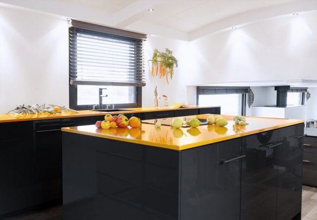 Si vous n'avez pas envie de changer de carrelage, vous pouvez aussi changer le plan de travail qui crée l'unité dans votre cuisine. Même si vous souhaitez un plan de travail en bois, ce dernier peut-être teinté pour apporter une touche de couleur. Vous pouvez de cette manière créer un contraste entre votre mobilier, la crédence et le plan de travail. Apporter de la couleur dans une pièce, même dans la cuisine, ne signifie pas nécessairement transformer votre espace en musée du Pop Art!