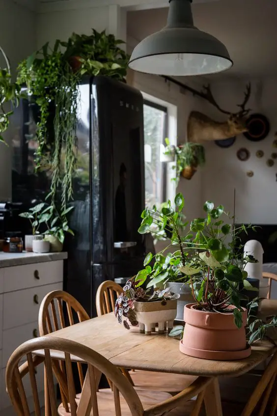 Le style Urban Jungle est intéressant parce qu'il s'adapte à de nombreuses situations. Vous avez des meubles de cuisine gris? C'est très bien, le gris s'associe parfaitement au vert des plantes. Et on n n'oublie pas une touche de blanc pour la luminosité. Votre mobilier de cuisine est blanc? Comme le gris, le blanc et le vert, ça s'harmonise sans aucun problème. Le vert des plantes d'intérieur va donner de la vie à votre mobilier. Votre cuisine est essentiellement en bois? Une fois encore, ça matche! Avec le bois, on reste dans une atmosphère naturelle qui sera renforcée par les plantes d'intérieur. L'essence du bois de votre cuisine n'a pas besoin d'être exotique pour que votre pièce de vie prenne des tonalités tropicales.