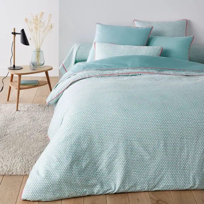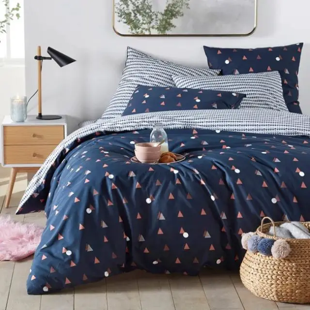 Moins commun, le bleu roi et le rose poudré pour un univers ancien et romantique. On est sur une gamme de couleurs plus intense mais qui n'empêche pas un cadre propice au sommeil. Et de manière plus contemporaine, on peu marier le bleu, le jaune et le corail pour une ambiance pop et dynamique. Le bleu (qu'il soit canard ou pas) avec du blanc et un fin liseré noir crée une ambiance à la Sarah Lavoine, simple, moderne et raffinée.