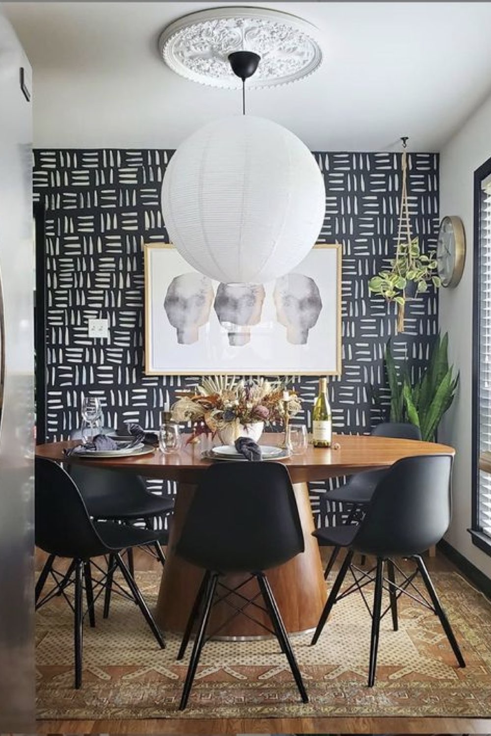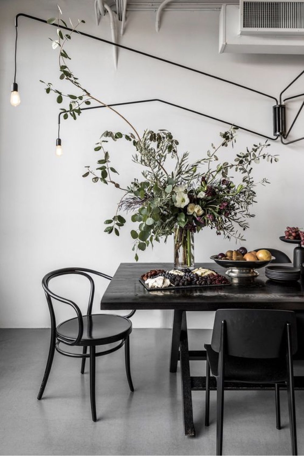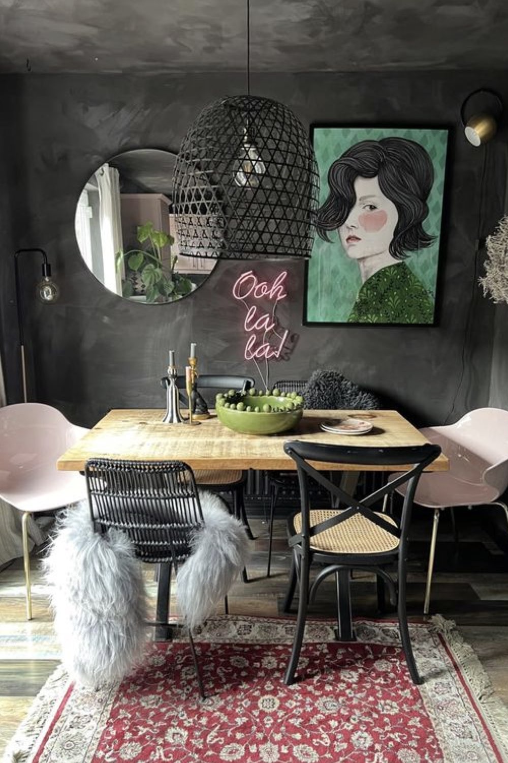 Et choisir une couleur qui sort de l'ordinaire permet de donner du cachet à l'espace... Plus ou moins comme si on lui donnait le petit truc en plus pour qu'on s'en souvienne. Le noir est aussi une couleur qui a beaucoup de coffre, une espèce de solennité moderne et donc utiliser cette couleur donne une certaine profondeur à la pièce. Les couleurs sombres (pas uniquement le noir) reviennent de plus en plus en déco après la folie scandinave où l'on mettait du blanc partout. Donc pourquoi pas y succomber dans la salle à manger?