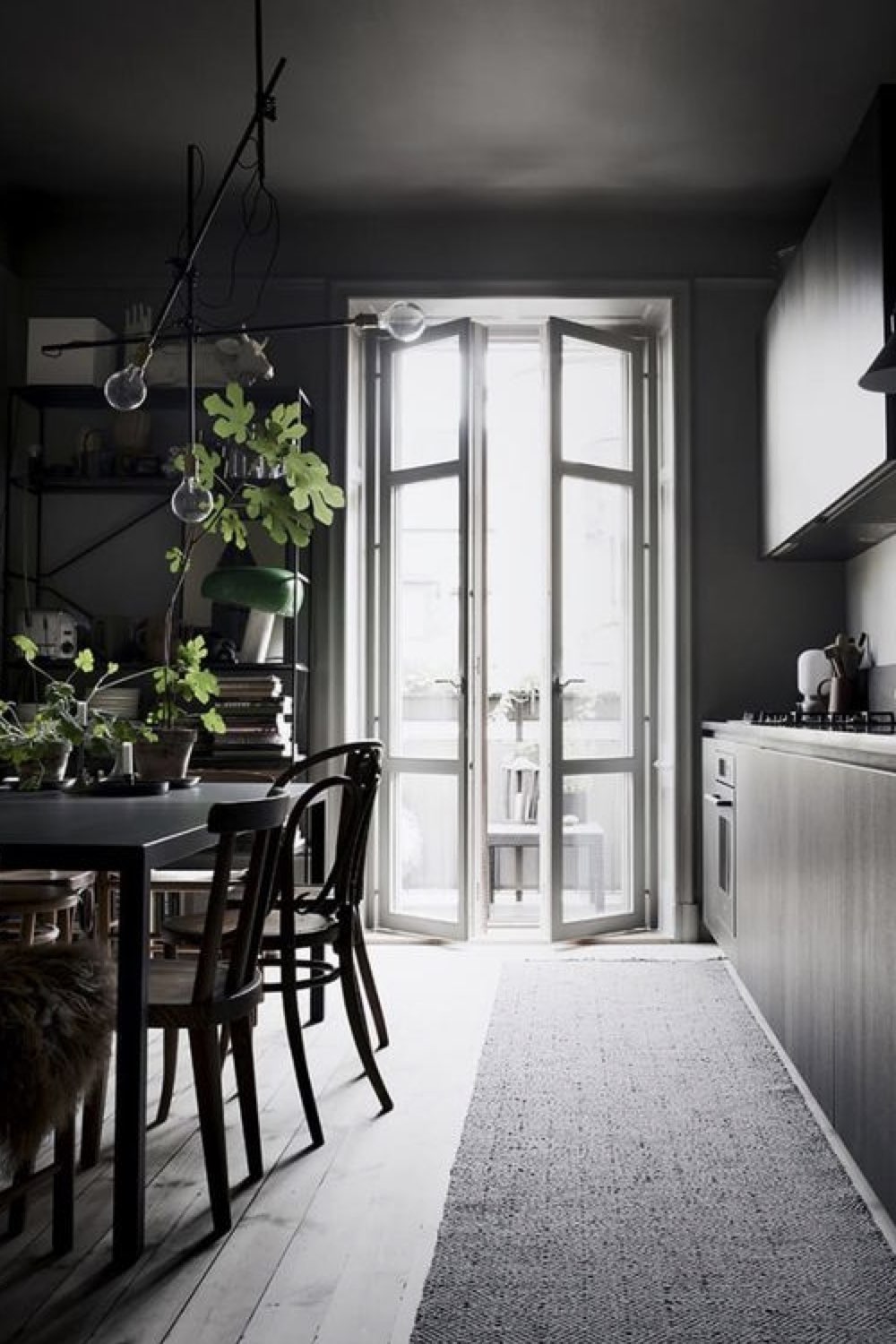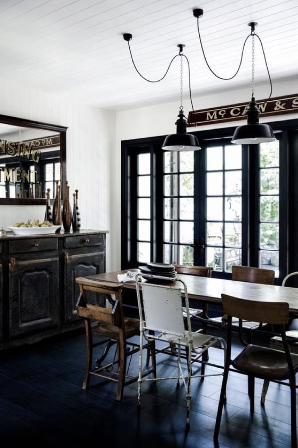 Même si précédemment, je vous ai parlé du noir sur les murs, je ne pouvais pas vous proposer un article incomplet. Donc pour terminer cet article, on va jeter un oeil du côté du mobilier de salle à manger. La table de salle à manger, les chaises, le buffet peuvent être en noir, intégralement ou partiellement. Si on aime le côté industriel, on peut choisir des chaises d'écoles dont l'armature est peinte en noir. Si vous savez peindre à la bombe c'est très rapide à mettre en oeuvre. Le contraste bois usé et noir est vraiment sympa. (C'est aussi pourquoi le style indus' perdure malgré les autres tendances qui émergent.)