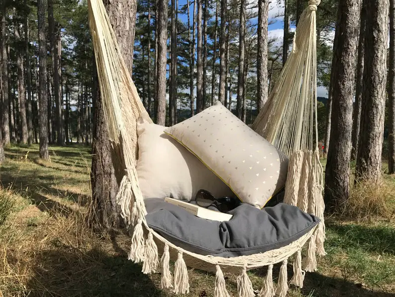Même si je vais vous présenter essentiellement des fauteuil pour une personne, je suis en vrai une grande fan des balancelle où l'on peut se poser à deux, histoire de profiter ensemble du moment. (Et se lover) Avec le retour du macramé dans la déco, on trouve assez facilement des fauteuils et des balancelles tissées en coton qui donneront une ambiance bohème à votre jardin.