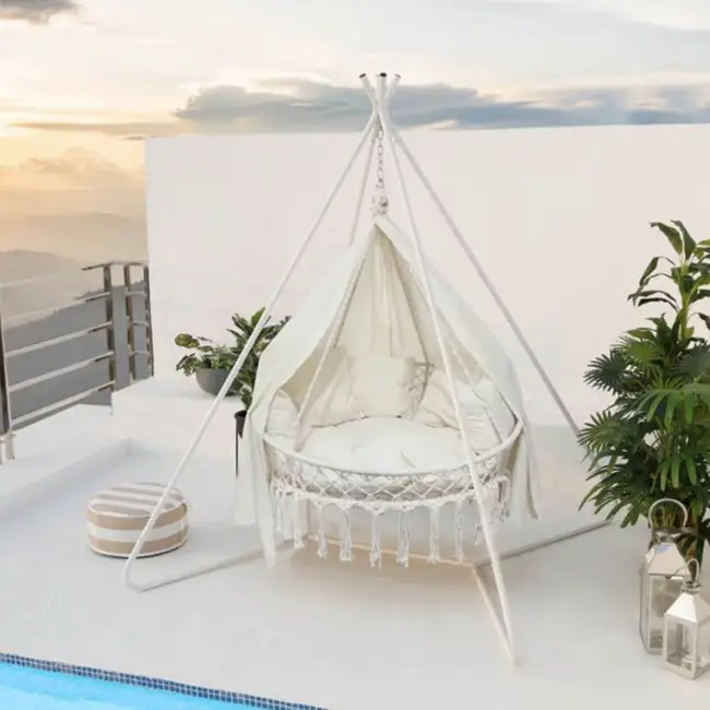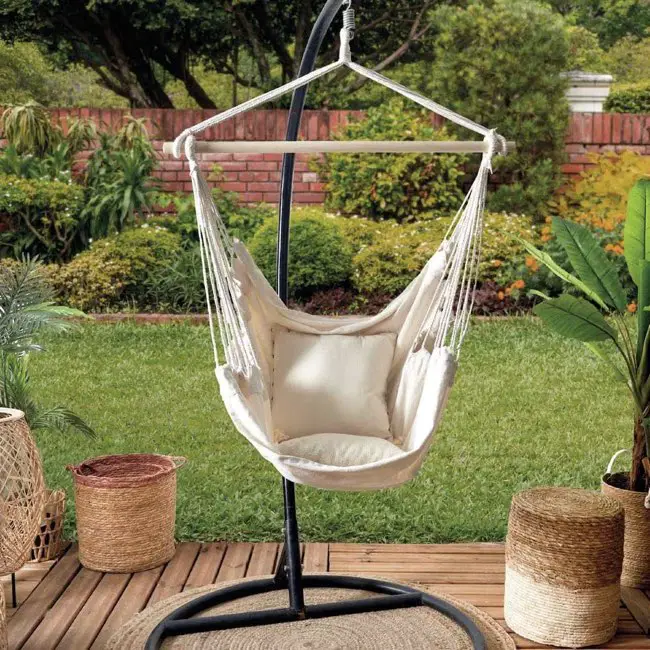Qui dit fauteuil suspendu dit un endroit où le suspendre et on n'a pas tous un arbre assez solide ou une pergola où l'on peut se suspendre en toute quiétude. Ce n'est pas grave, il existe des solution autoportée avec une structure qui remplace l'arbre.