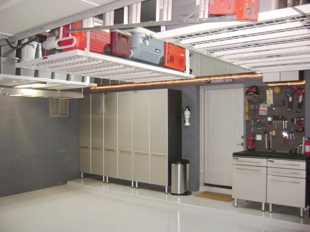Le garage est définitivement une pièce à part dans la maison puisque c'est la seule pièce où l'on peut se permettre de créer des rangements au plafond. La seule chose qu'il faut prendre en compte c'est que ce type de rangement ne doit rien entraver: ne pas déranger le passage, ne pas entraver l'ouverture de la porte de garage... Une fois que ce détail de taille est pris en compte, rien ne vous empêche d'utiliser le plafond pour ranger les vélo ou encore les planches à voile. Cette solution d'aménagement est intéressante puisqu'elle libère de la place au sol.