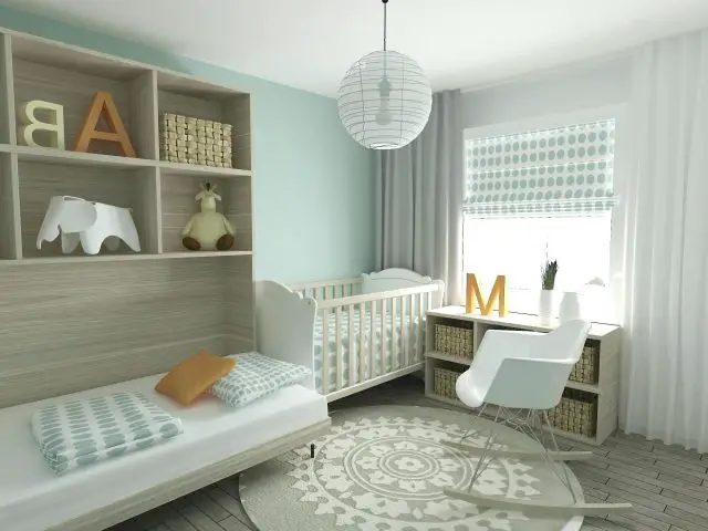 Autre couleur tout aussi tendance: le vert sauge. C'est aussi une couleur qui trouve sa place partout ailleurs dans la maison. C'est une couleur moderne et contemporaine. Et une fois encore on est dans le registre de la couleur naturelle. C'est un vert qui est frais et doux. Le vert sauge est un mélange de vert et de gris. On a donc les caractéristiques cosy du gris avec une couleur plus vibrante. Même si la couleur dominante de la chambre de bébé est blanche, choisir de peindre le mobilier en vert sauge créera un effet cocon moderne.
