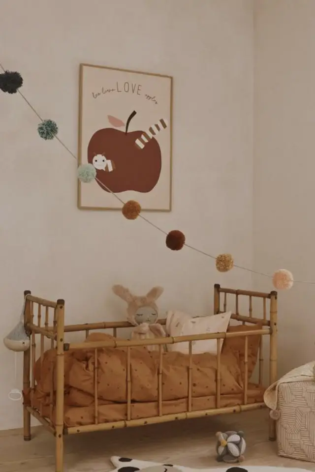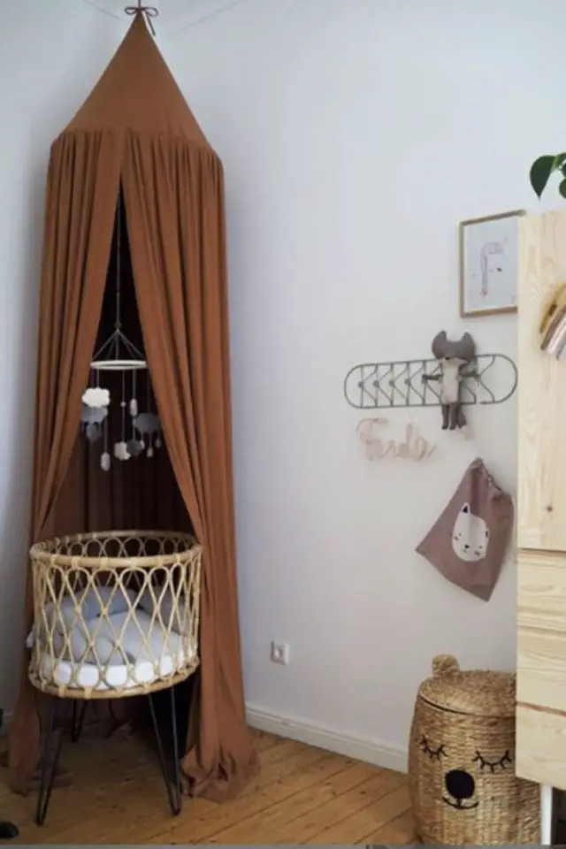 Le terracotta est une une couleur qui plait dans toute la maison et elle a tout à fait sa place dans la chambre de bébé. Ce qui est intéressant avec cette couleur c'est qu'elle fait partie de la gamme des couleurs chaudes et organiques. Comme si on cherchait à créer un environnement doux et enveloppant pour bébé, un univers naturel et simple. La couleur terre-cuite se retrouve aussi bien sous la forme de peinture que sous la forme textile avec le linge de lit ou encore un joli ciel de lit au dessus du berceau.