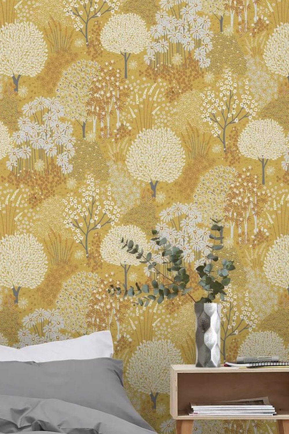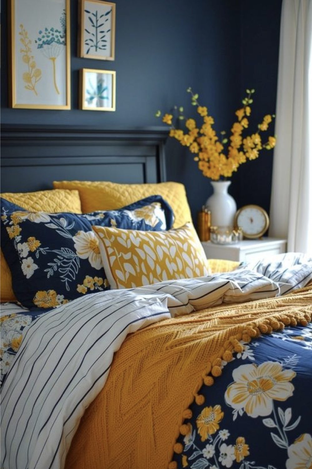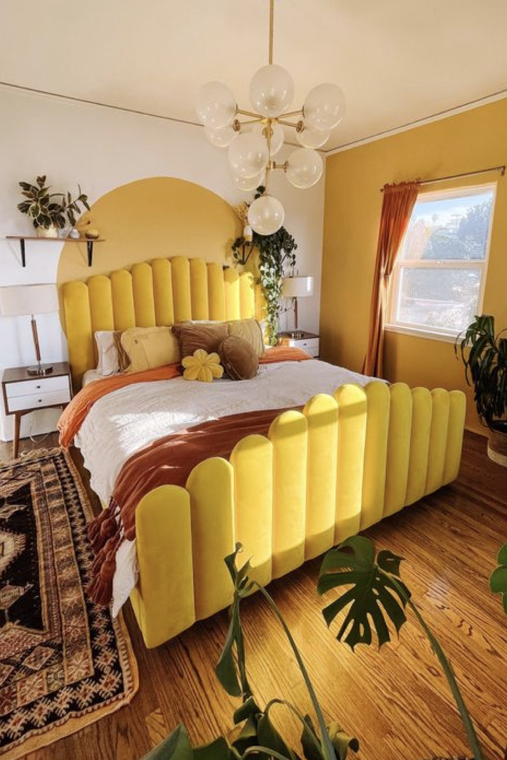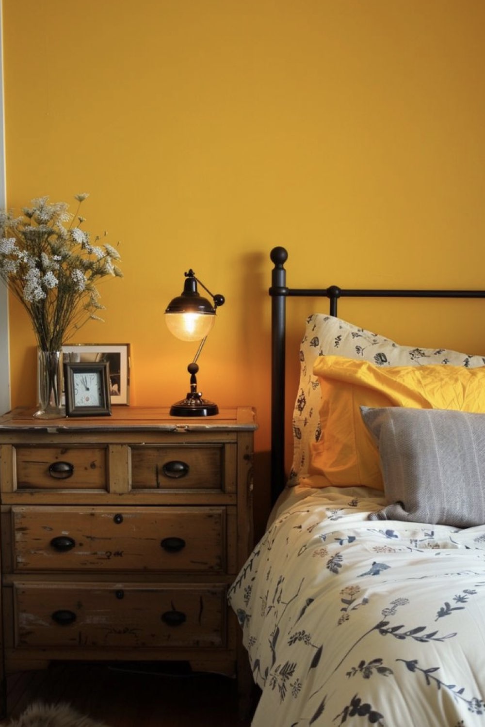 Le jaune tirant vers le orange est plein de vitalité et rappelle le soleil. C'est idéal dans une chambre froide. Cependant, il n'est pas recommandé de repeindre tous les murs de la chambre avec une couleur aussi vive. Le blanc et le gris vont l'adoucir. Le gris qu'il soit clair ou foncé s'associe parfaitement lui aussi avec le jaune. Je n'aime pas donné un genre à la déco, mais généralement, le gris et le jaune sont associés à un univers masculin sans que ça ne soit austère.