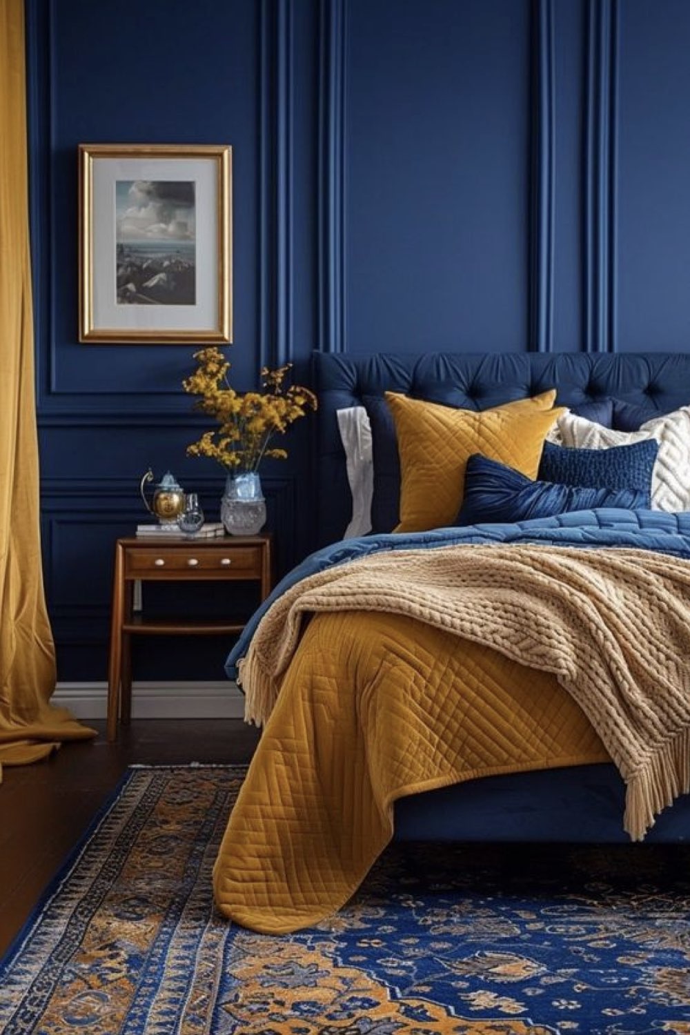 Le jaune moutarde est une couleur contemporaine qui permet de créer des combinaisons de couleurs très sympa avec du blanc, du noir mais aussi un bleu canard. Le succès de ces combinaisons de couleurs réside dans le dosage de ces dernières. En ce qui concerne le noir,il sert généralement à relever le jaune, créer un contraste et à délimiter. Le blanc adoucit. Le bleu tranche et contraste. La chaleur contre le froid, même si le bleu canard est plus chaleureux qu'un pastel par exemple.